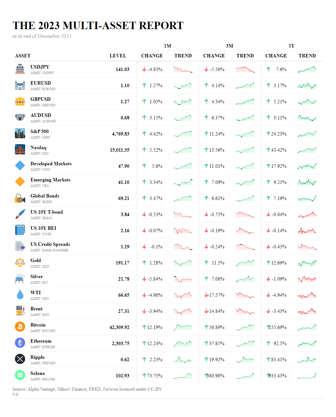In summary, the multi-asset performance of 2023 can be characterized as one of dichotomy. With traditional safe-haven assets and risk assets both advancing, it reflects a market that is hedging its bets—balancing the potential for growth against the ongoing economic uncertainty. Investors have navigated this complex landscape with a clear tilt towards growth and innovation, while remaining cognizant of the value of diversification in a period marked by significant macroeconomic challenges.